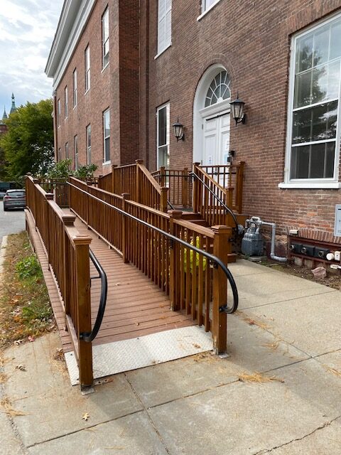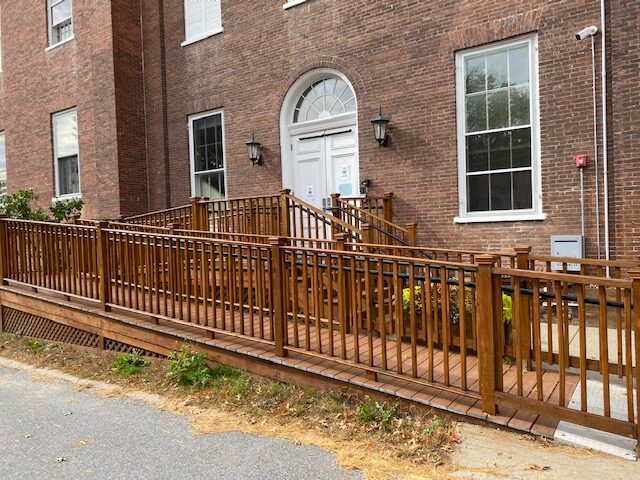 There is an accessible parking space located behind the northeast side of the building Monday through Saturday. On Sunday mornings and for larger events, all parking spaces along the back (north) wall of the Meeting House, and one space next to the ramp are all reserved for people requiring accessible parking spaces.